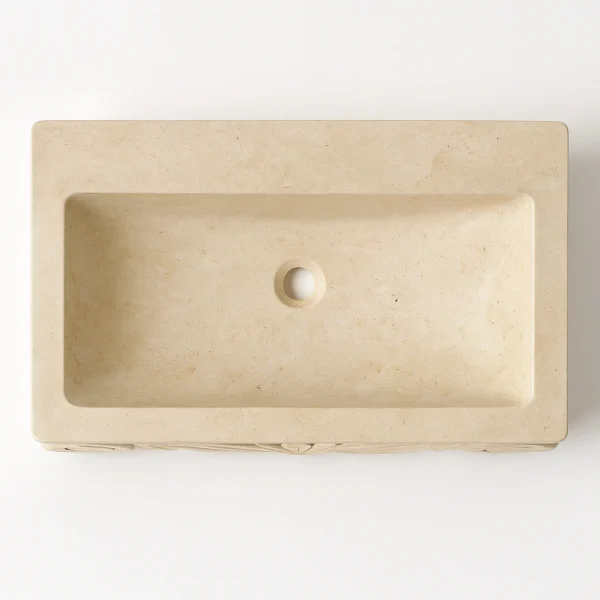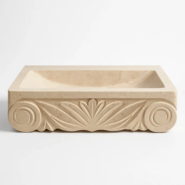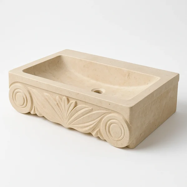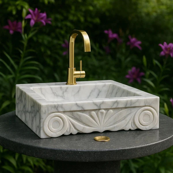 Inspired by classical architectural motifs, this handcrafted marble sink showcases intricate carvings that merge artistry with craftsmanship. The front relief design offers a refined balance between traditional elegance and modern geometry. Sculpted from a single block of natural stone, it embodies both durability and sculptural beauty — a centerpiece that brings historical sophistication to any bathroom.