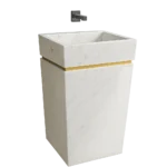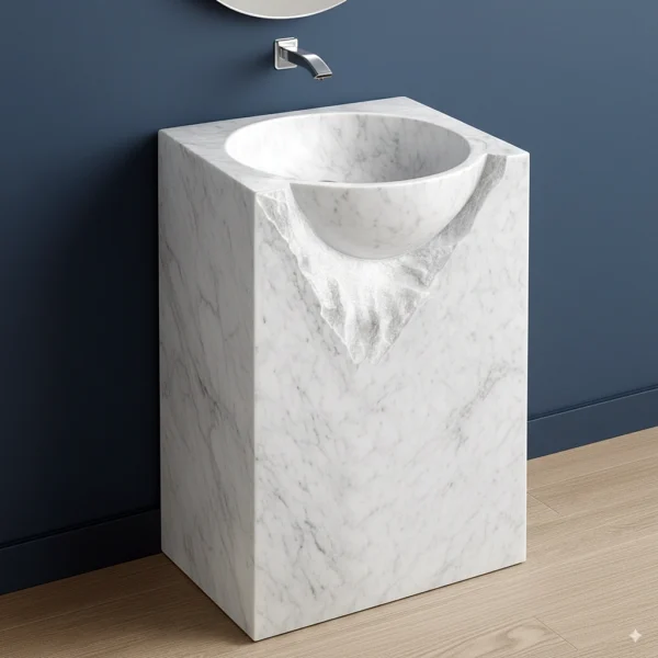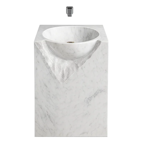 This marble pedestal sink combines modern geometry with the natural beauty of stone. The round basin is seamlessly integrated into a square marble pedestal, enhanced with a unique carved stone effect that highlights its handcrafted artistry. Made from premium natural marble, each sink features one-of-a-kind veining for an exclusive design. Ideal for luxury bathrooms, boutique interiors, and high-end renovations, this freestanding basin is both a functional piece and a statement of timeless elegance.
