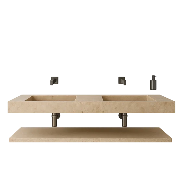 This wall-mounted double basin marble sink combines modern aesthetics with practical functionality. Expertly crafted from solid marble, it features two spacious basins, a sleek rectangular design, and a seamless polished finish, making it a perfect centerpiece for shared or family bathrooms. Built for durability and timeless elegance, it enhances both style and usability.