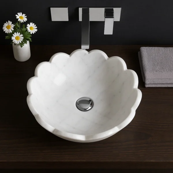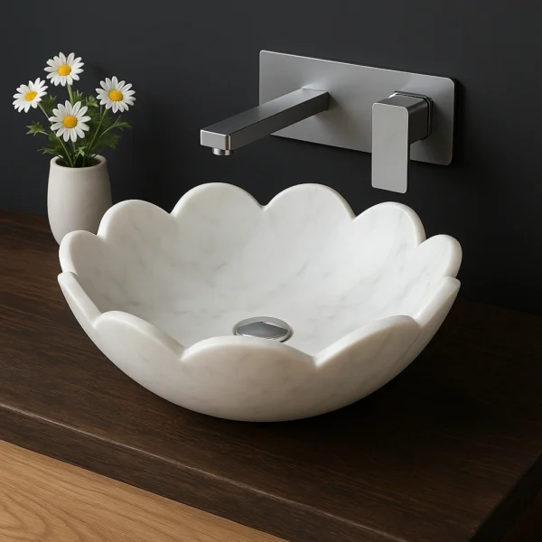 Crafted from natural marble, this flower-shaped countertop sink brings elegance and artistry to any bathroom. Its distinctive petal-inspired edges set it apart from traditional round basins, adding a sculptural touch to your space. Built for durability, the solid marble body ensures long-lasting use, while the polished surface provides easy maintenance and a refined finish. A perfect choice to complement both modern and classic bathroom interiors.