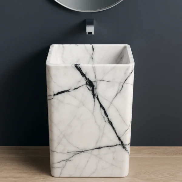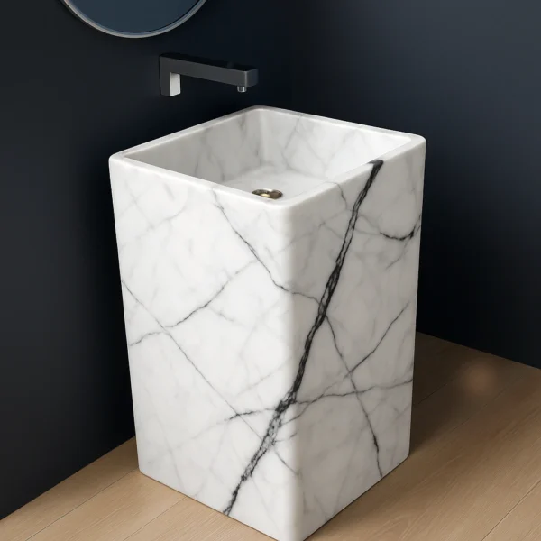 This freestanding marble pedestal sink is designed with clean geometric lines and a refined minimalist structure, making it a statement piece for any modern bathroom. Expertly carved from solid marble, it combines durability with timeless elegance. The pedestal form ensures stability while offering a sleek, space-saving solution, ideal for both residential and commercial interiors. With its contemporary design and artisanal craftsmanship, this sink enhances bathrooms with a sense of luxury and sophistication.