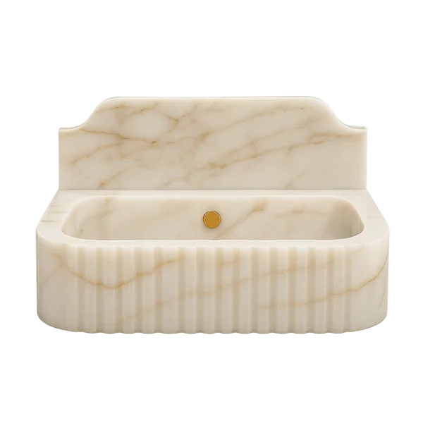 This handcrafted marble sink combines timeless elegance with refined craftsmanship, creating a luxurious focal point for any bathroom. The elevated back panel provides a graceful silhouette and offers a perfect surface for wall-mounted faucets, while the fluted front detailing adds texture and architectural depth to the design.