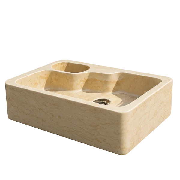 This handcrafted marble sink features a refined double-bowl design that balances elegance and functionality. Softly rounded edges and a smooth surface highlight its contemporary character, while the solid stone construction conveys timeless strength. Each basin is carefully carved to create seamless water flow and visual harmony — a perfect statement piece for modern and sophisticated bathroom interiors.