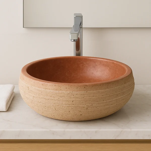 This handmade marble sink features a finely textured exterior and a smooth polished interior, blending natural charm with modern elegance. Crafted from durable natural stone, it offers long-lasting use and a refined look. Perfect for bathrooms and living spaces, it adds a stylish and timeless touch to any setting.