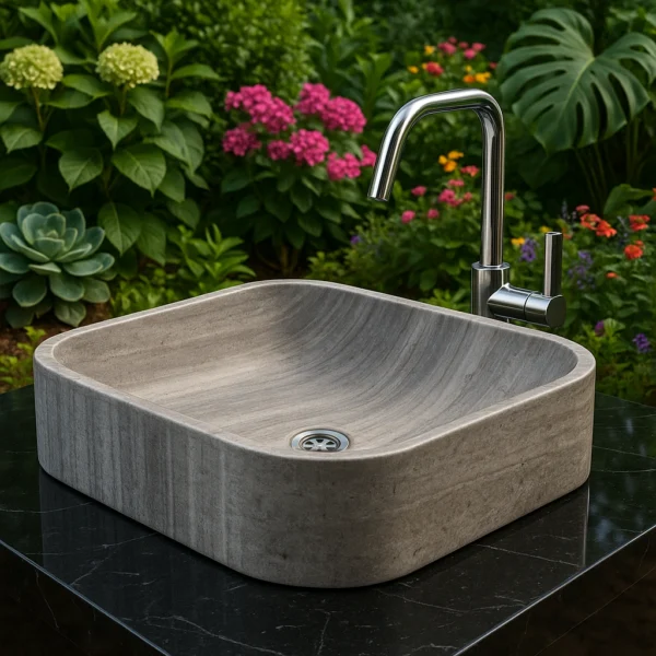 This marble sink features a refined rectangular shape softened by elegantly rounded corners, blending modern design with natural elegance. Its spacious inner basin and smooth surface provide both visual harmony and practical comfort. Handcrafted from a single block of stone, it embodies the perfect balance of strength, simplicity, and sophistication , ideal for contemporary interiors seeking timeless style.
