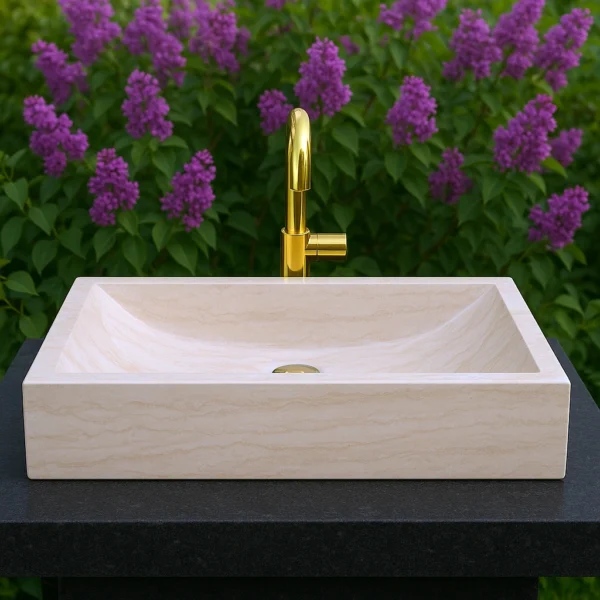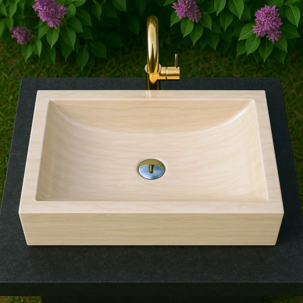 This handcrafted marble sink features a refined rectangular form with softly curved inner lines, reflecting the essence of minimalist design. The wide, shallow basin allows a natural water flow while maintaining an elegant architectural profile. Carved from a single block of stone, it embodies durability, precision, and sophistication — perfect for modern interiors seeking timeless simplicity and natural charm.