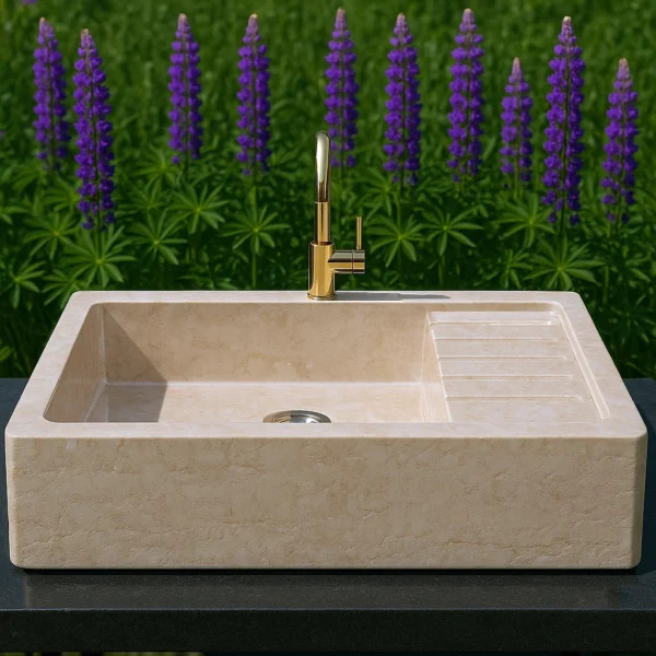 This handcrafted marble sink features a spacious single-bowl design with a seamlessly integrated draining area, combining practicality with refined aesthetics. The clean rectangular shape reflects modern minimalism, while the solid stone construction ensures durability and elegance. Each piece is meticulously carved from a single block of marble, making it a timeless centerpiece for contemporary kitchens or bathrooms seeking natural sophistication.