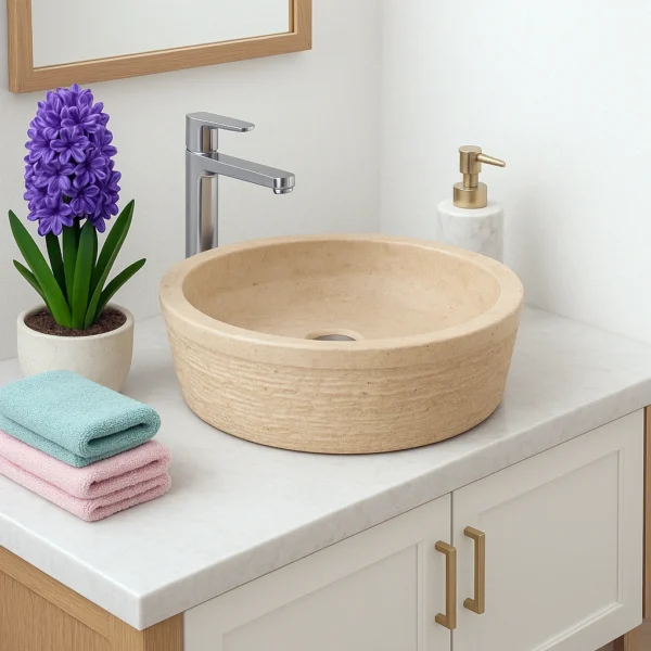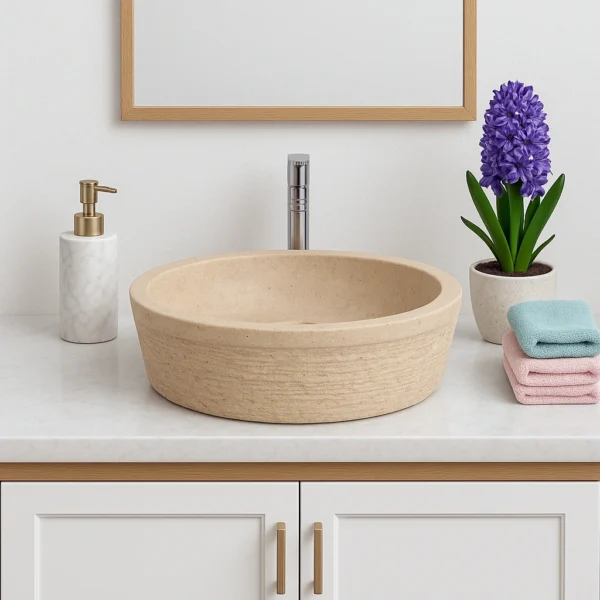 Crafted from natural travertine marble, this round sink brings warmth and sophistication to your bathroom. The hand-finished surface highlights the unique texture of the stone, while the smooth interior ensures comfortable everyday use. Strong and durable, it is built for long-lasting performance. A versatile piece that complements both modern and classic interiors, adding a refined touch to any bathroom décor.