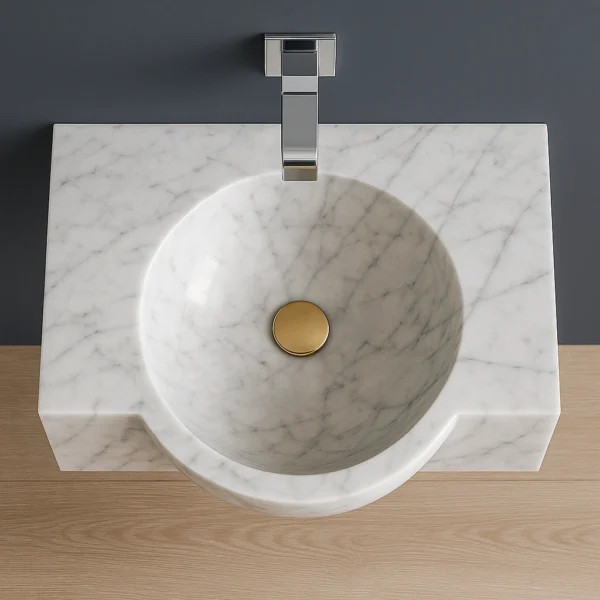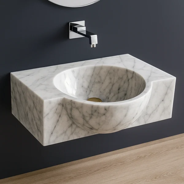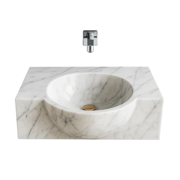 This wall-mounted marble basin features a seamless, sculptural design that combines durability with timeless elegance. Its smooth, rounded bowl integrated into a solid rectangular form offers a striking balance of style and function. Perfect for modern and classic interiors alike, this basin elevates any bathroom with its refined craftsmanship. Designed for everyday practicality and long-lasting use, it stands as a centerpiece of luxury and sophistication.
