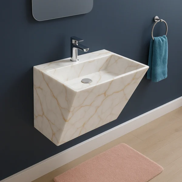 This wall-mounted marble sink features a bold geometric form that brings a contemporary statement to any bathroom. Its angled silhouette combines functionality with a sculptural touch, making it both practical and visually striking. Handcrafted from solid marble, the sink offers durability, easy maintenance, and a refined finish ideal for modern interiors.